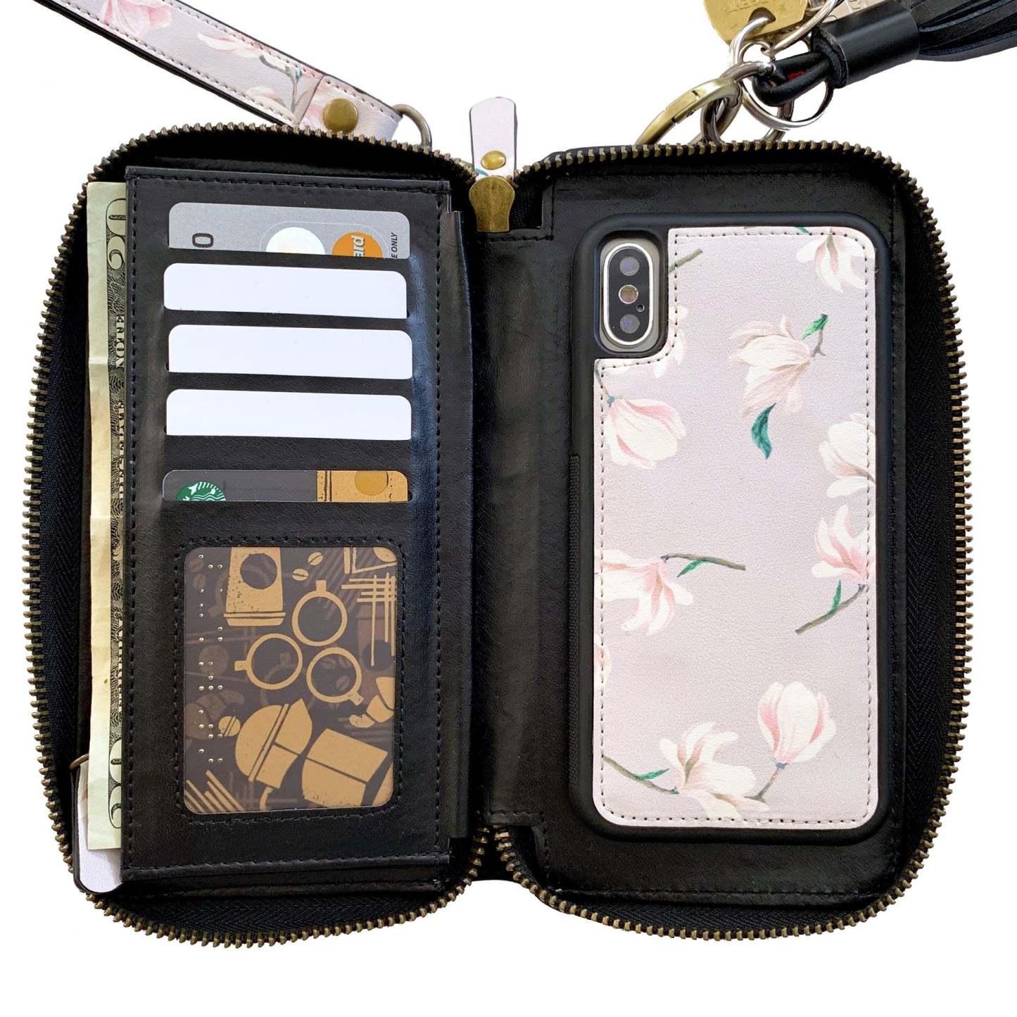 Mit einem umfangreichen Kartenhalter vorne und einem hochwertigen Reißverschluss-Wallet hinten, das mit einem passenden abnehmbaren Handgelenkriemen ausgestattet ist.